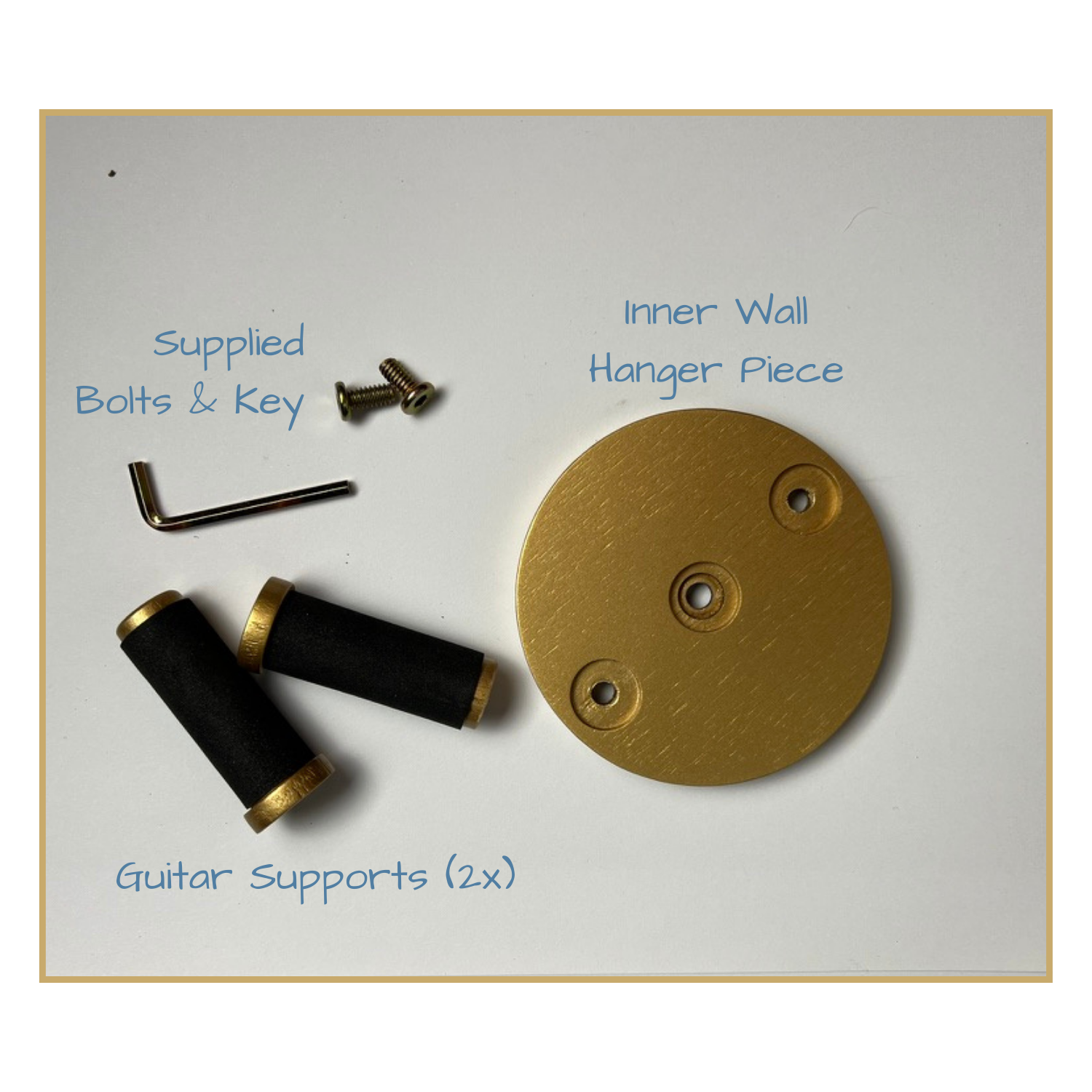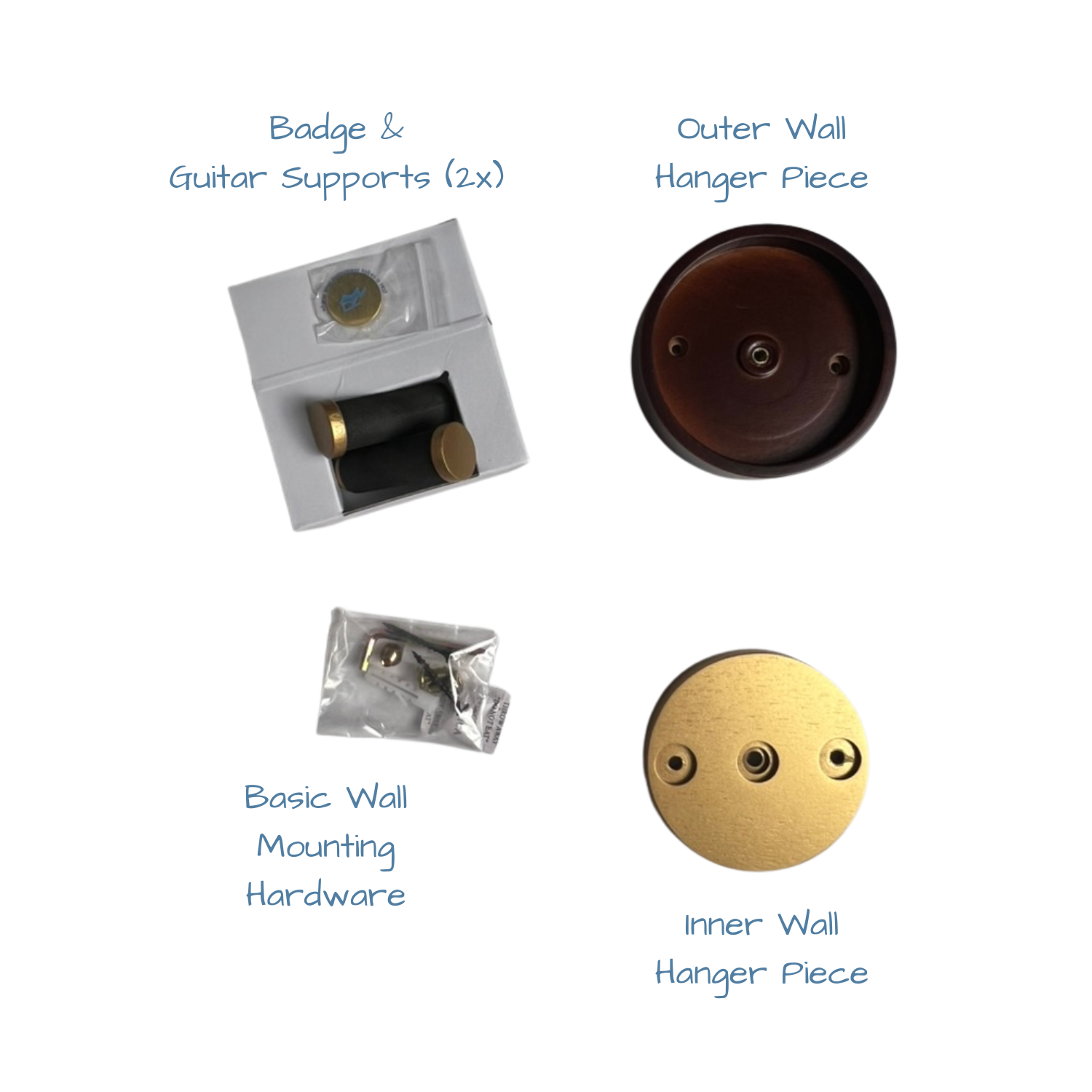 The inner wall hanger pieces consist of two guitar supports, the inner wall hanger and applicable hardware.
